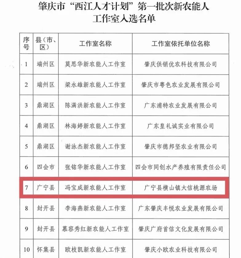 近日,肇庆市“西江人才计划”第一批次新农能人工作室名单正式公布,广宁县横山镇大信桃源农场负责人冯宝成主持的“冯宝成新农能人工作室”成功入选,成为广宁县此次唯一上榜的新农能人工作室股票杠杆配资平台,而冯宝成本人也获评“新农人101”优秀代表。